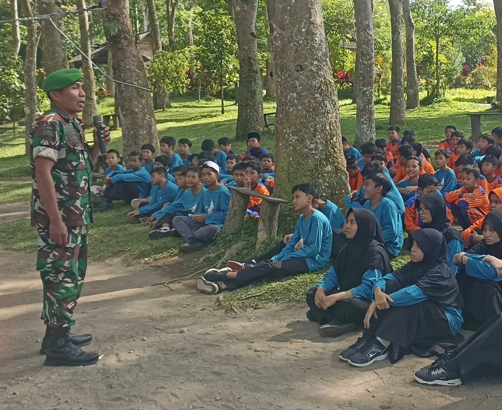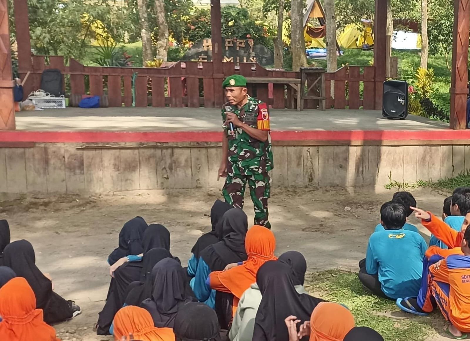BN News. Blitar || Dalam menanamkan semangat cinta tanah air sejak dini, Bati Komsos Koramil 0808/02 Garum Pelda Slamet R memberikan materi pengenalan Bela Negara kepada peserta perkemahan SD IT Alhikmah Kelurahan Bence. Kegiatan ini dilaksanakan di kawasan wisata Bon C perkebunan Petung Ombo Desa Karangrejo Kecamatan Garum Kabupaten Blitar, Kamis (9/10/2025).