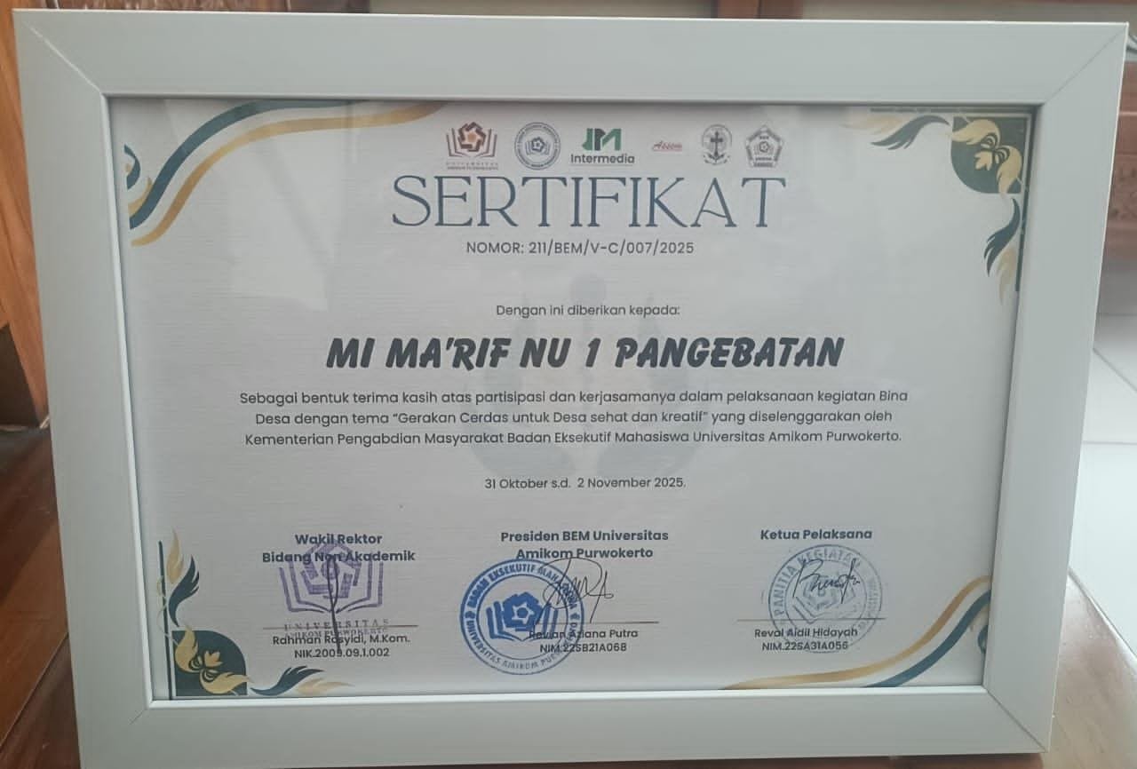 BN News. Banyumas || Dalam suasana hangat dan penuh rasa syukur, MI Ma’arif NU 01 Pangebatan, Kecamatan Karanglewas, Kabupaten Banyumas, Jawa Tengah, menerima Sertifikat Nomor: 211/BEM/V-C/007/2025 dari Badan Eksekutif Mahasiswa Universitas AMIKOM Purwokerto, Kamis (06/11/2025).