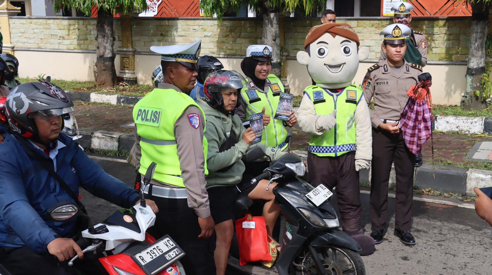 Petugas gabungan membagikan pamflet, memasang stiker keselamatan di kendaraan. Selain itu, menyampaikan pesan-pesan tertib lalu lintas melalui media wayang dan badut yang menarik perhatian pengendara.
