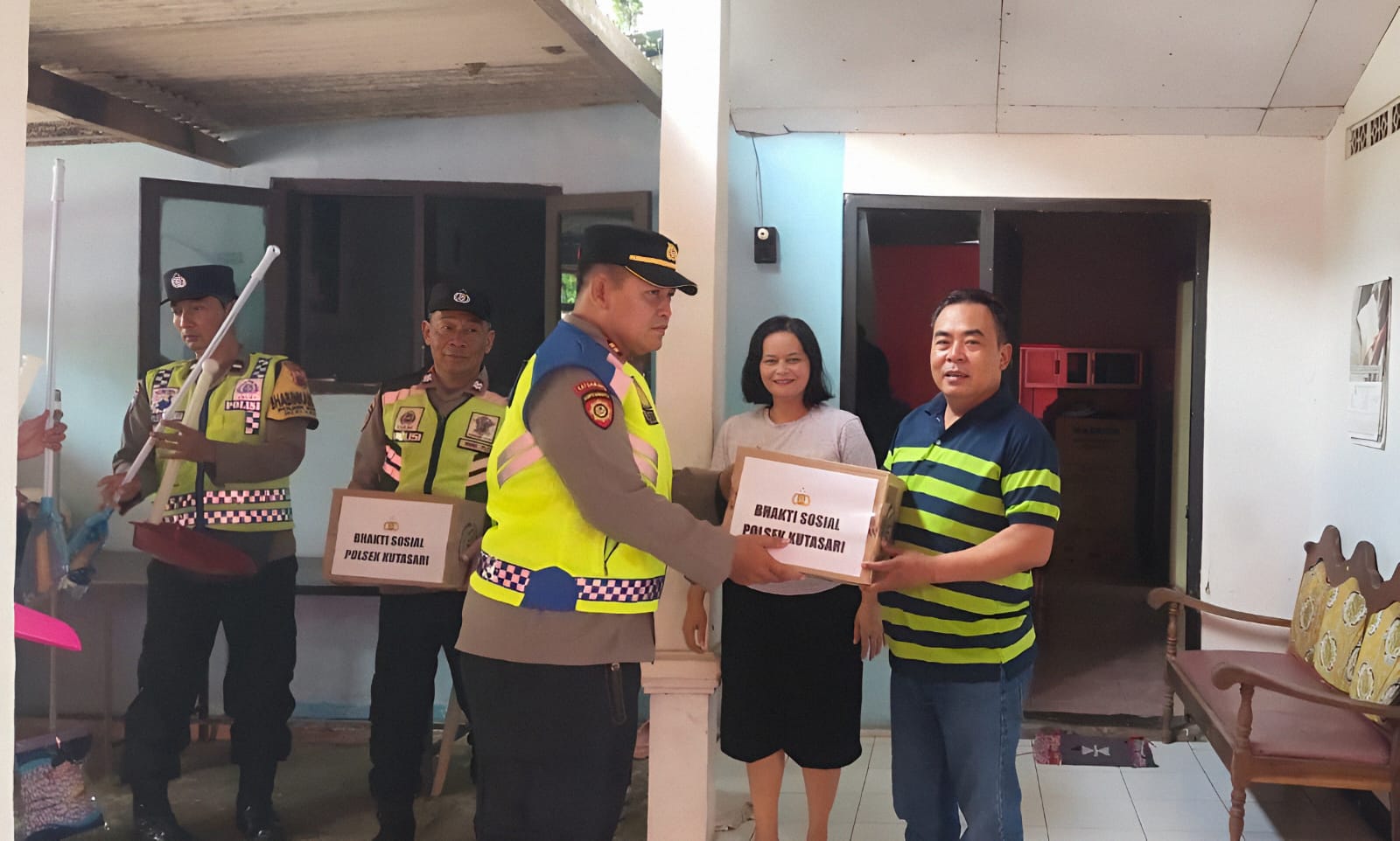 Dalam kegiatan tersebut, jajaran Polsek Kutasari menyerahkan bantuan berupa paket sembako dan alat kebersihan kepada pihak gereja. Selain itu, usai silaturahmi personel Polsek Kutasari melaksanakan kerja bakti membersihkan gereja dan lingkungannya.