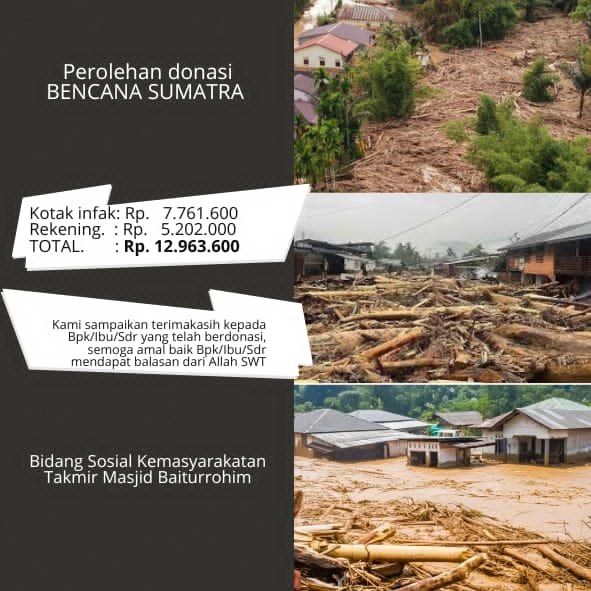 “Penggalangan dana untuk korban bencana banjir dan longsor di Sumatra kami lakukan melalui kotak infak sebesar Rp.7.761.600 dan melalui rekening sebesar Rp.5.202.000. Total donasi yang terkumpul sebesar Rp.12.963.600,” ungkapnya.