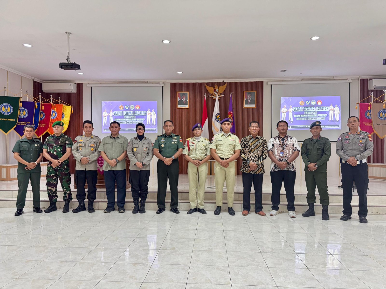 BN NEWS, Yogyakarta || Korps Gabungan Potensi Pertahanan Forum Kader Bela Negara Daerah Istimewa Yogyakarta (Kogaphan FKBN DIY), sebagai salah satu unsur potensi pertahanan negara di wilayah Daerah Istimewa Yogyakarta, menghadiri kegiatan Serah Terima Jabatan Satuan Resimen Mahasiswa (Satmenwa) Batalyon II Pasopati Universitas Negeri Yogyakarta (UNY) Periode 2026. Kegiatan tersebut dilaksanakan di Aula Student Center UNY, Rabu (21/01/2026).
