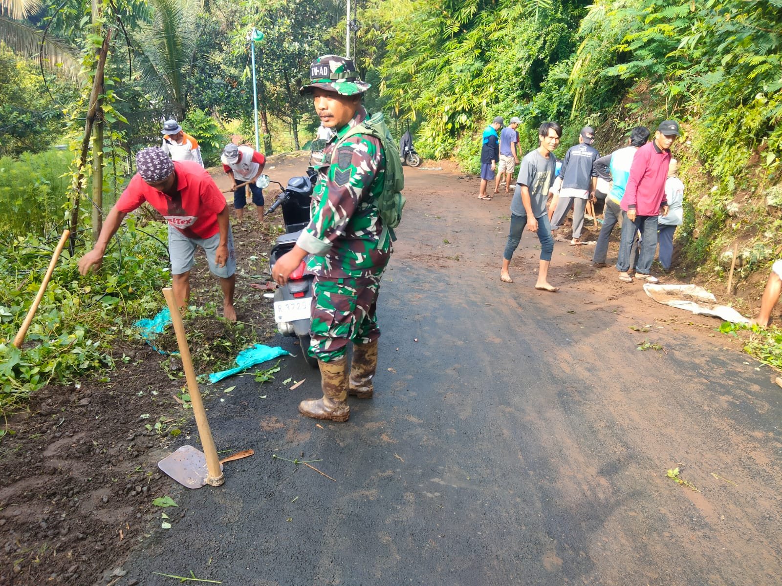 Dengan menggunakan peralatan seadanya seperti cangkul, sekop, dan alat manual lainnya, Babinsa bersama warga secara bahu-membahu membersihkan tanah dan material longsoran hingga jalan dapat kembali dilalui kendaraan dan pejalan kaki.