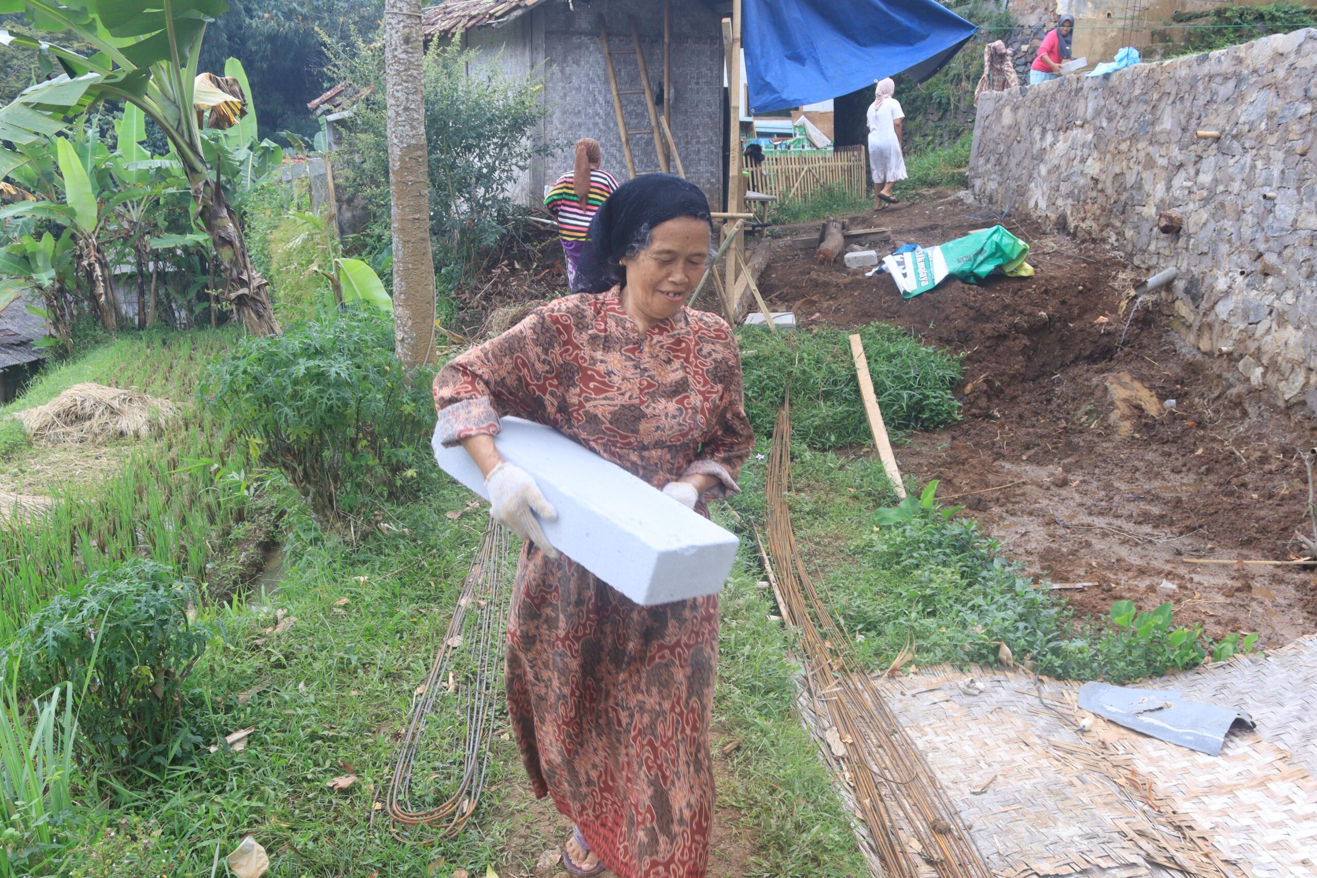Di usia yang tak lagi muda, Ibu Juju tetap hadir setiap hari di lokasi pembangunan. Dengan langkah perlahan namun pasti, ia ikut membantu pekerjaan ringan, mengangkat bata ringan, menyiapkan alat, hingga merapikan kebutuhan di sekitar lokasi kerja.